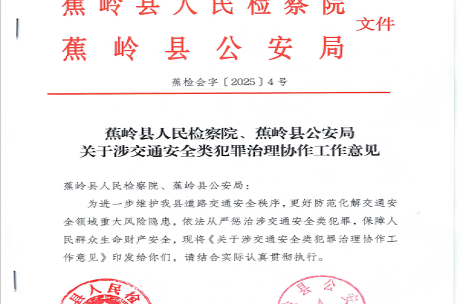 为进一步深化检察机关与公安机关在惩治和预防交通安全类犯罪工作中的协作配合,形成打击犯罪与诉源治理的合力,近日,我院联合蕉岭县公安局共同签署了《关于涉交通安全类犯罪治理协作工作意见》。《意见》要求,检警双方应着眼于推动“个案办理”向“类案治理”“系统治理”转变,以提升道路交通安全治理效能为核心,通过深化检警协作、规范执法办案、完善行刑衔接、强化源头预防、建立定期会商与案件介入机制等,在重要证据标准、案件快速办理和行刑反向衔接方面达成共识;《意见》还明确了强化诉源治理,细化检警在源头监管、法治宣传与警示教育等方面的联动举措,以协同共治筑牢道路交通安全法治防线。接下来,检警双方将以此为契机,持续增强协作共识、压实工作责任,推进打击治理涉交通安全类犯罪各项协作机制落地生效,推动交通安全治理向“源头防控”转型,切实维护群众出行安全与公共安全。